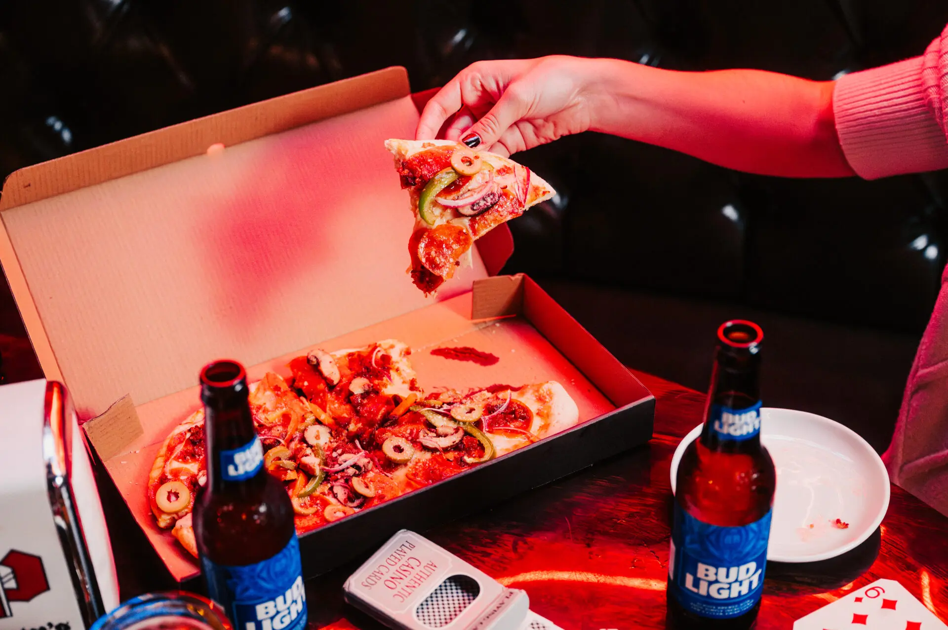 house spun dough, marinara, mozzarella, pork & beef pepperoni, bacon, bell peppers, onions, mushrooms, green olives, garlic oil, aged parmesan