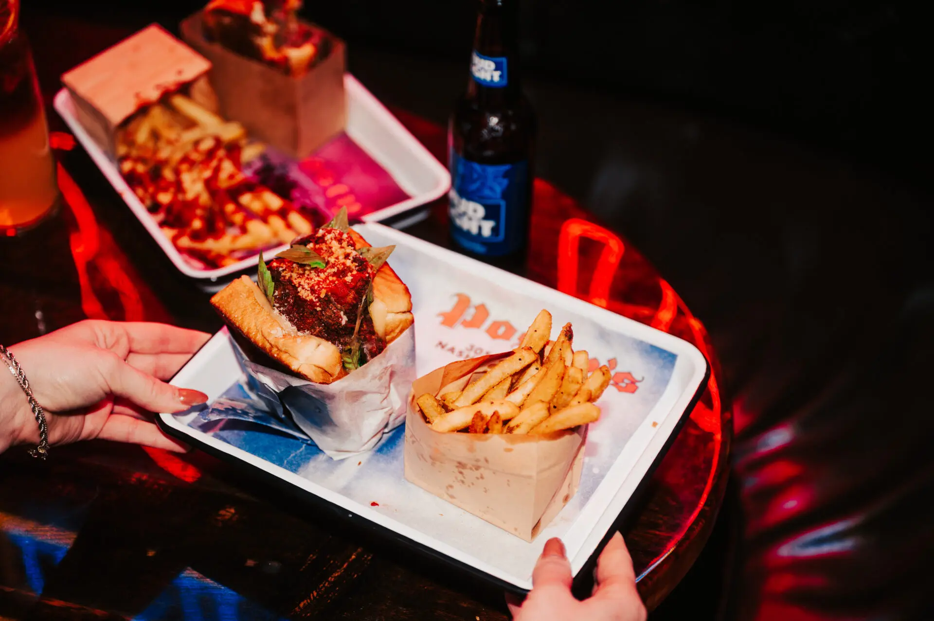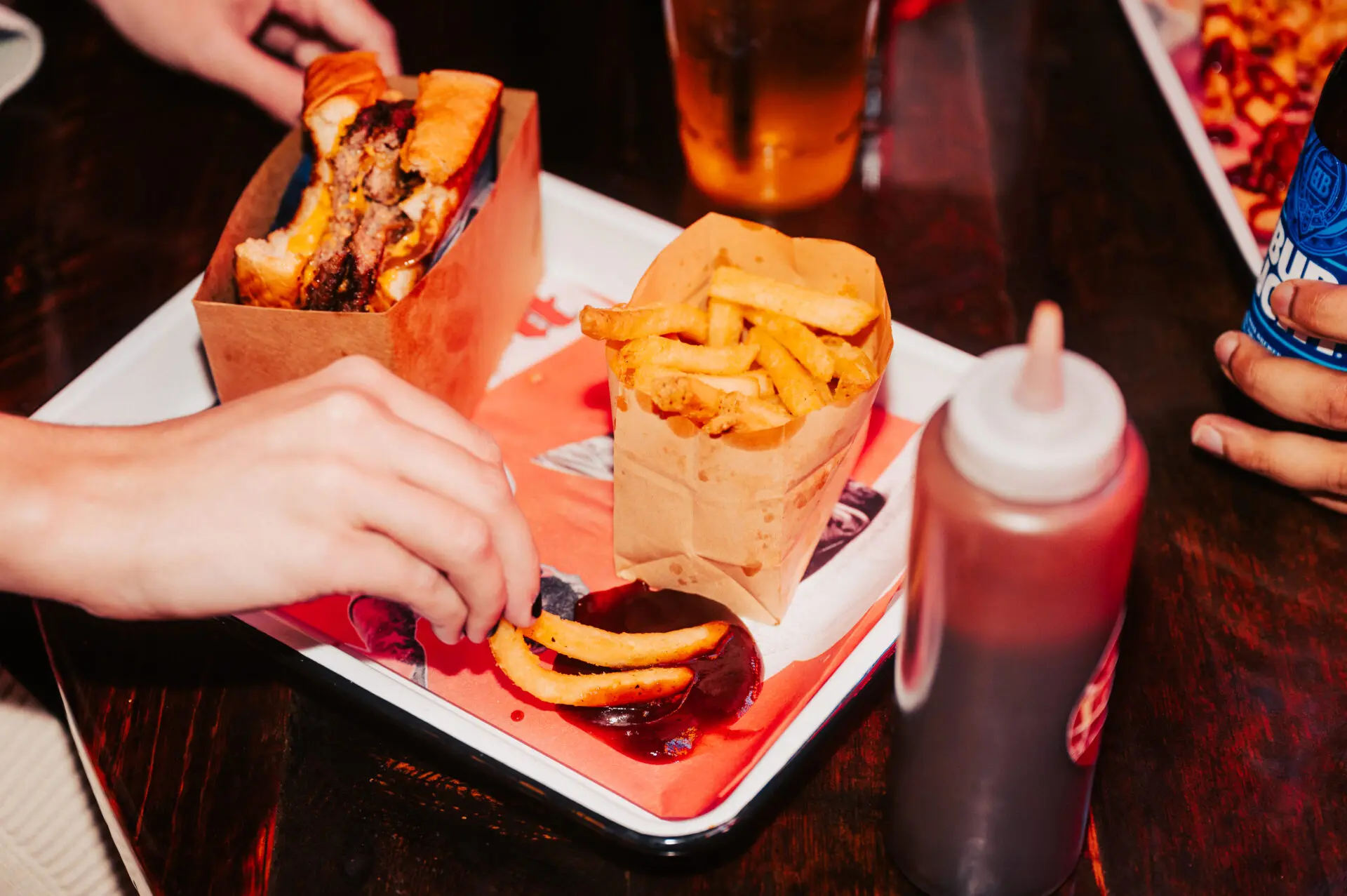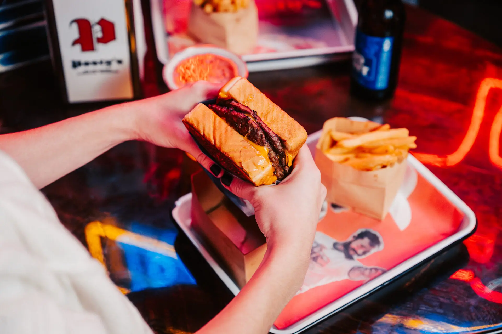 brisket and steak burger blend, double stacked, American cheese, smash sauce, pickle chips, brioche bun, fries