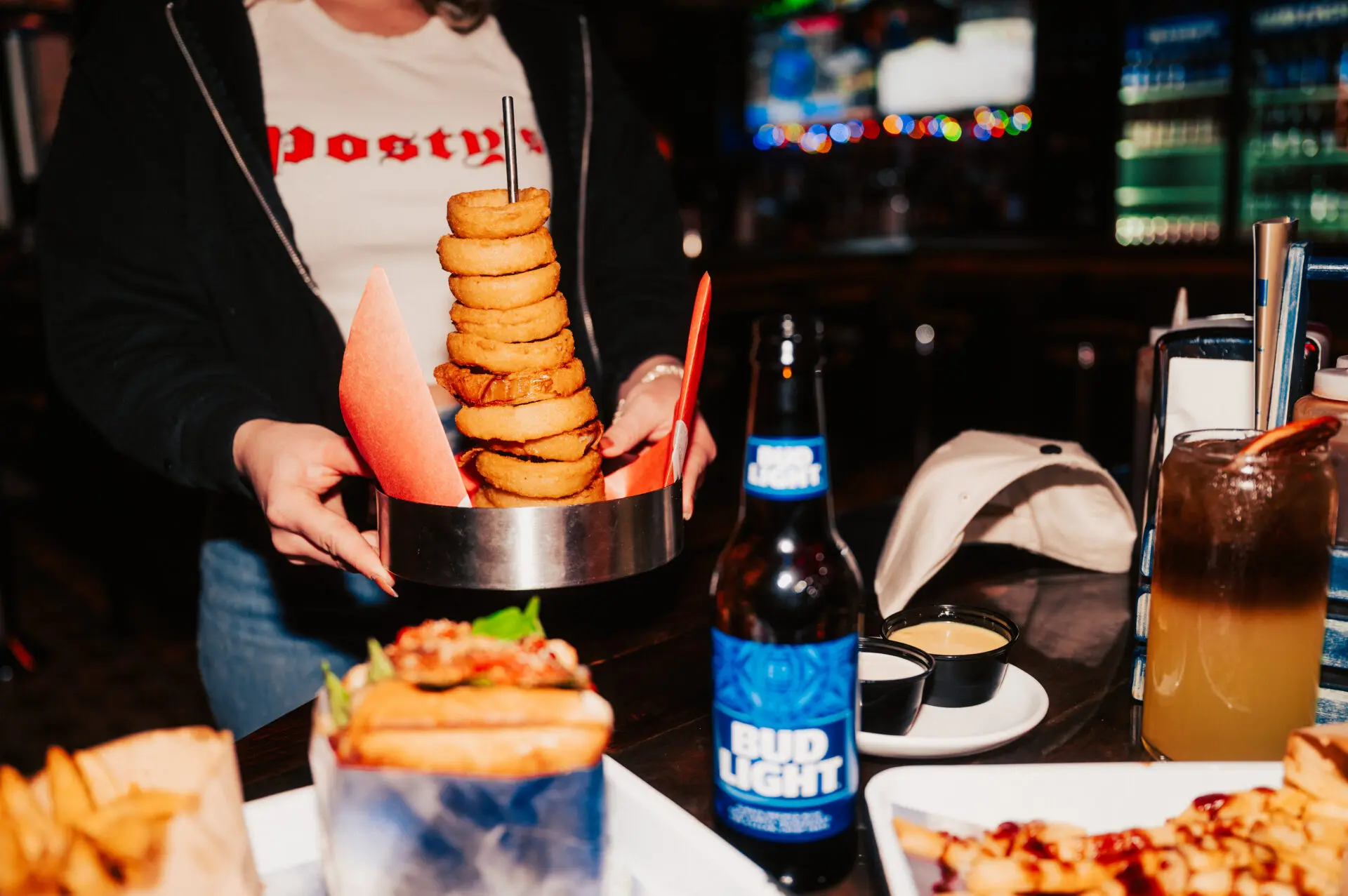 crispy fried onion rings, piled high, dipping sauces