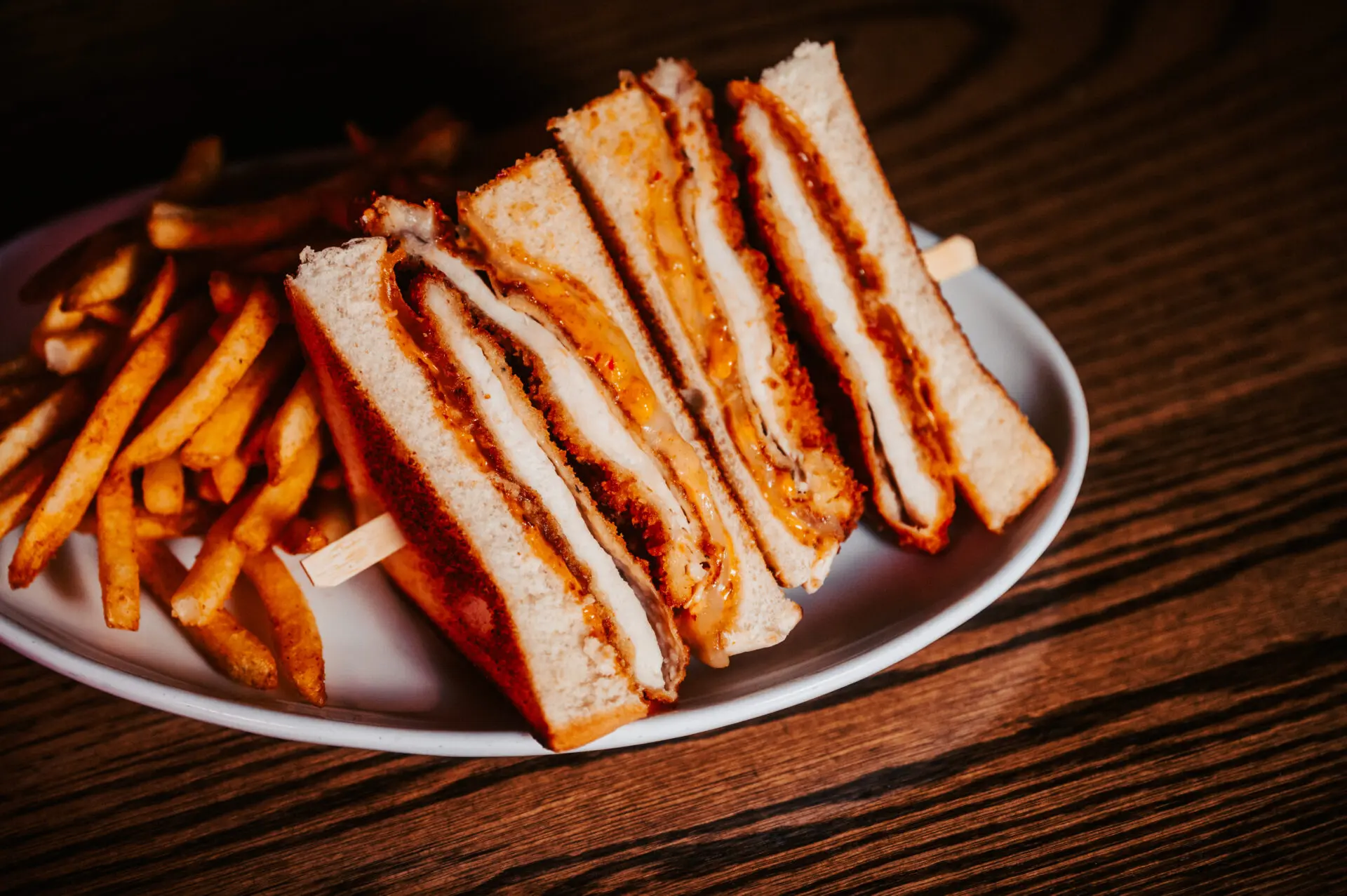 lightly breaded crispy chicken breast , spicy mayo, cheddar and havarti cheeses, Texas toast, fries