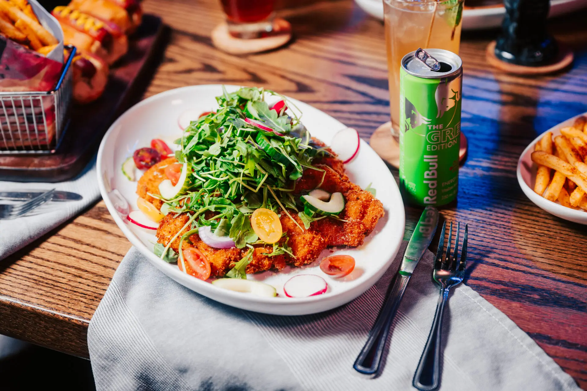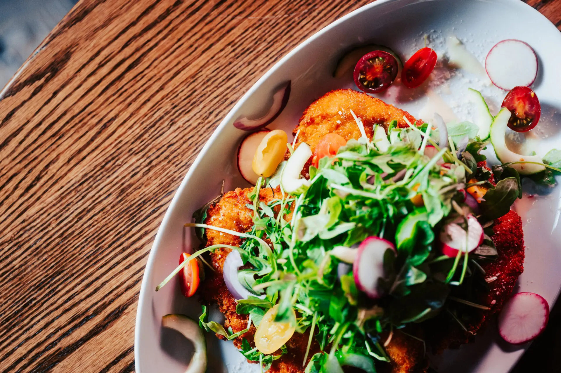 lightly breaded crispy chicken breasts, aged parmesan, caramelized lemon, arugula salad, radish, tomato, red onion, cucumber, lemon vinaigrette
