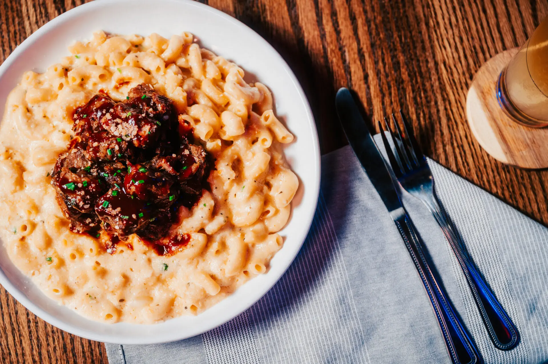 Jumbo elbow macaroni, decadent cheese sauce, brisket burnt ends, whiskey BBQ glaze, chives
